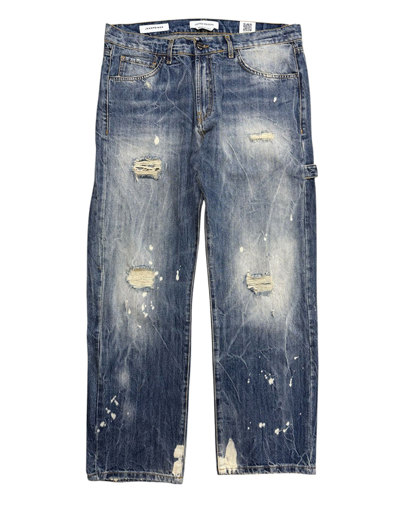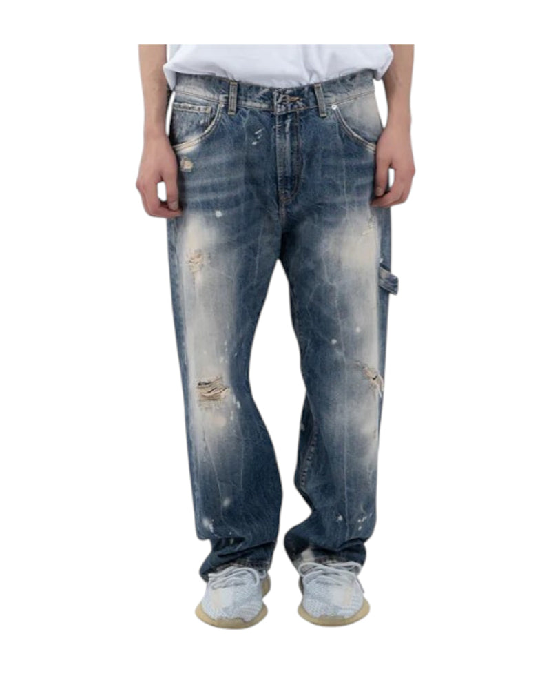 Jeans modello baggy, cinque tasche, chiusura frontale con zip e bottone, effetto vintage.