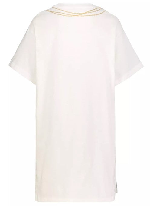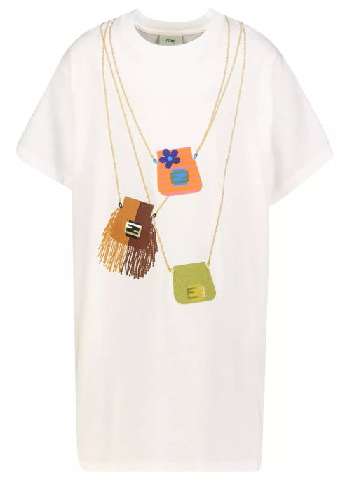 Abito girocollo a manica corta, applicazione e stampa sul davanti.