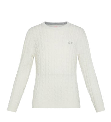 Maglia girocollo motivo a treccia, logo ricamato sul petto, collo orlo e polsi in costa.