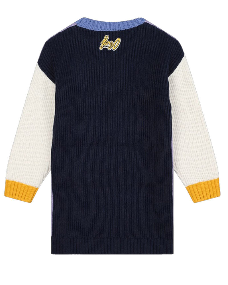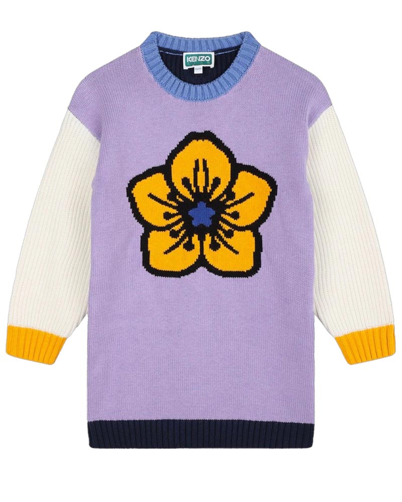 Abito muticolor da bambina realizzata in filato di cotone. Presenta colletto tondo, maniche lunghe e finiture a coste. È decorata con motivo fiore ad intarsio sulla parte anteriore e con applicazione patch logo sulla parte posteriore.