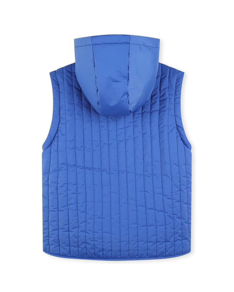 Giubbino imbottito da bambina, presenta design trapuntato, cappuccio fisso, maniche lunghe estraibili, con polsi elasticizzati, chiusura frontale con zip, due tasche con patta appiccate sul davanti. È decorato con patch logo applicata sul davanti.