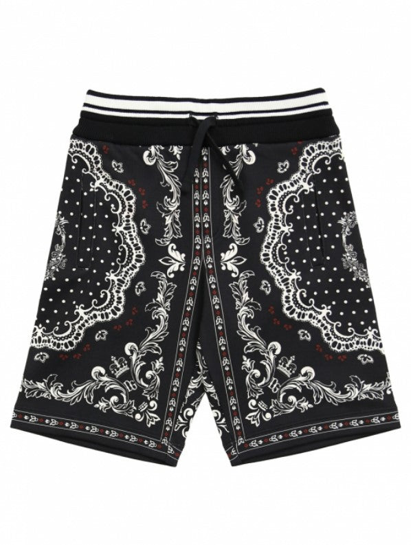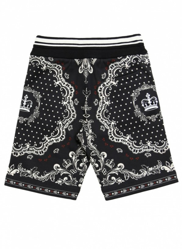 Bermuda bimbo felpa con elastico e coulisse in vita, tasche a filetto, fantasia logata all over, taschino posteriore.