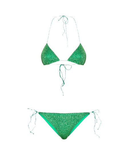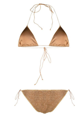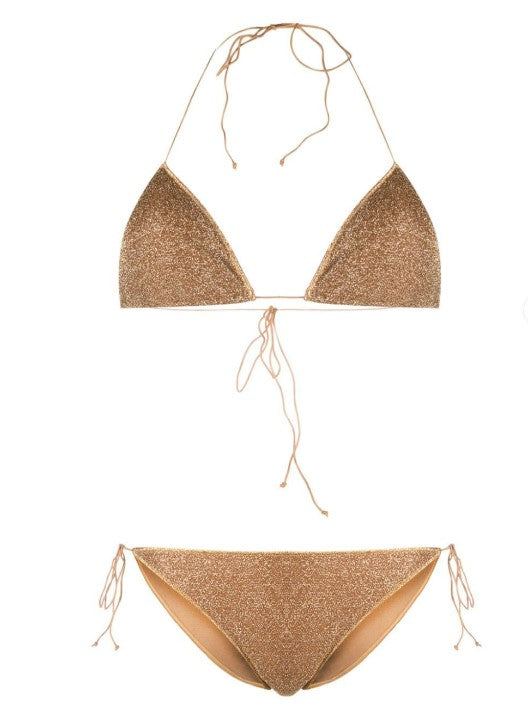 Costume da bambina due pezzi realizzato in tessuto lurex. Top modello a triangolo, chiusura posteriore con laccio sottile.