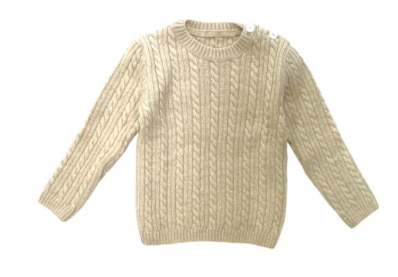 Maglia girocollo in lana, motivo a treccia, logo ricamato sul davanti, bottoncini di chiusura sulla spalla.