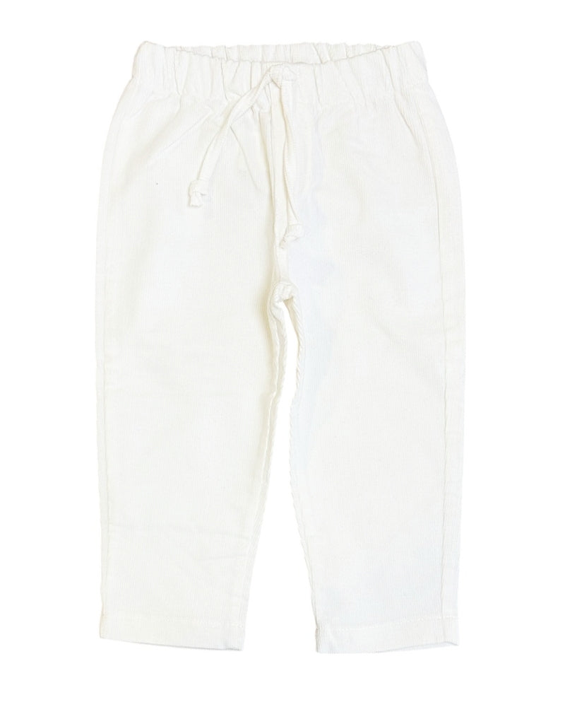 Pantaloni realizzati in velluto a costine da bambino. Presentano vita elasticizzata con coulisse, tasche laterali america e tasca applicata sul retro.