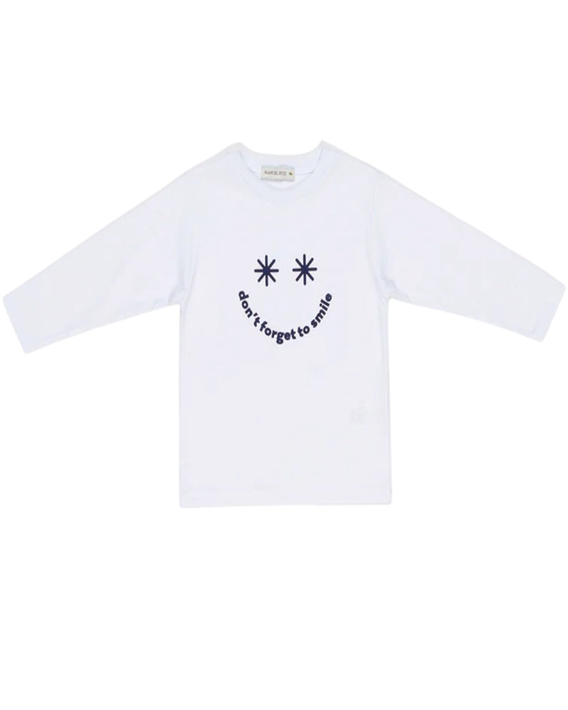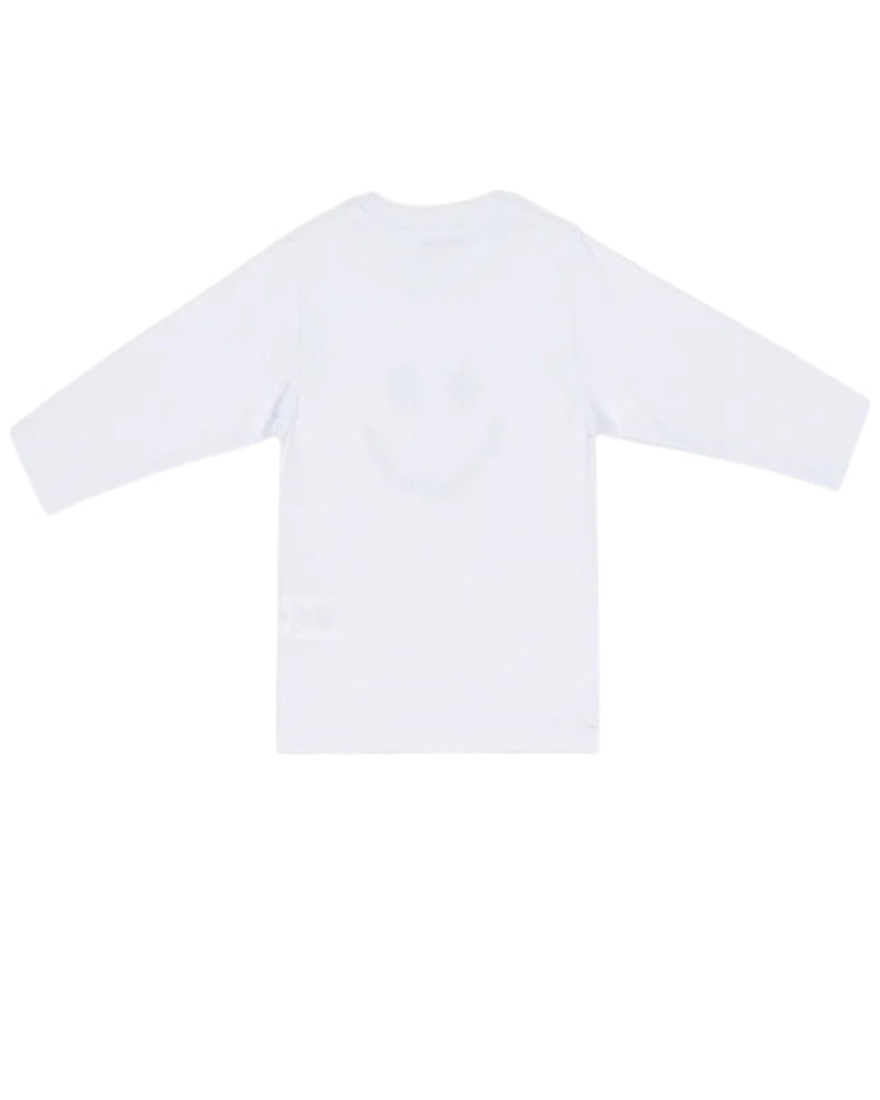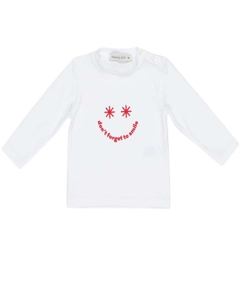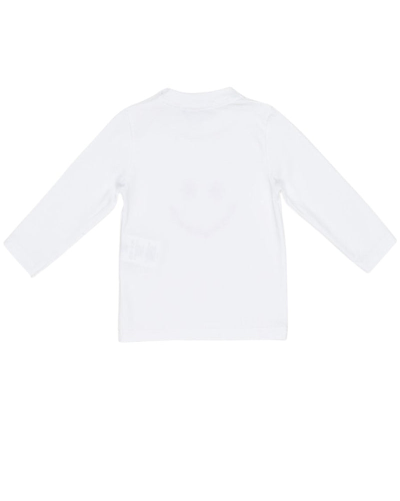 T-shirt bianca da neonato realizzata in jersey di cotone, è caratterizzata da colletto tondo, maniche lunghe, stampa sul davanti e chiusura con bottoncini sulla spalla.