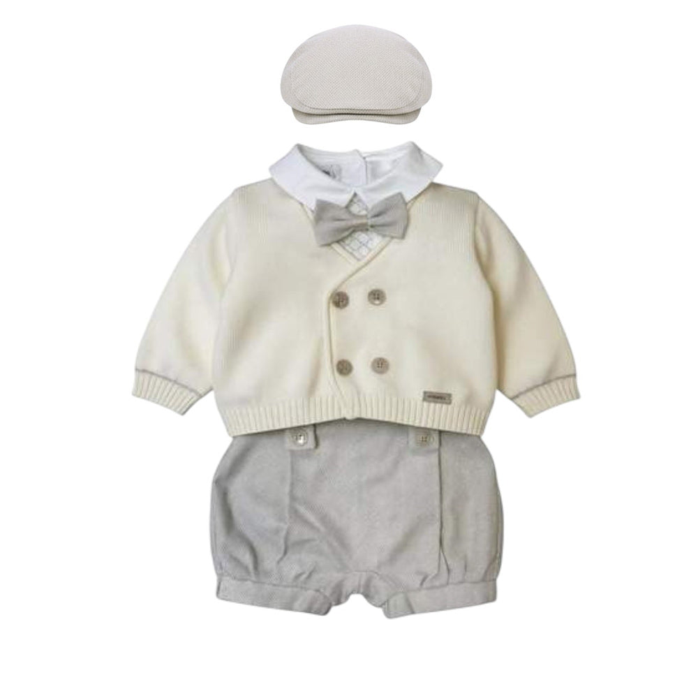 Completo 4 pezzi con ricamo a contrasto e papillon removibile cardigan con 4 bottoni sul davanti pantaloncino a culotte con bretelle e coppola.