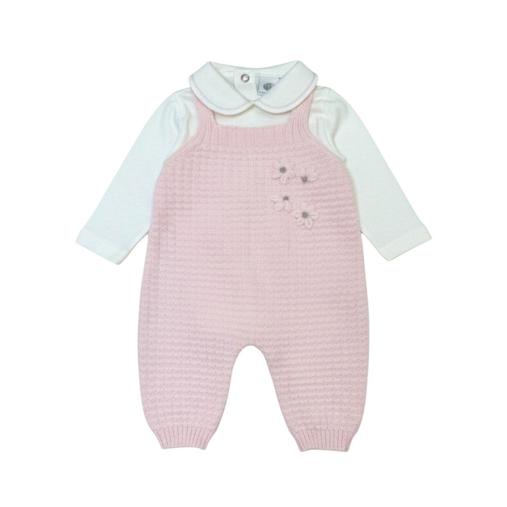 Tutina modello a salopette Marlù in lana color rosa chiaro; il modello presenta body con colletto in cotone bianco, salopette lavorazione a treccia sul fronte e ricami con fiorellini. completa di cardigan abbinato