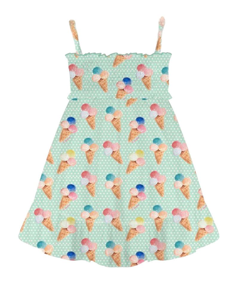 Abito Miki realizzato in cotone da bambina. Presenta spalline elasticizzate, corpetto elasticizzato e balza sul fondo. È decorato con stampa Pois Cone all-over.
