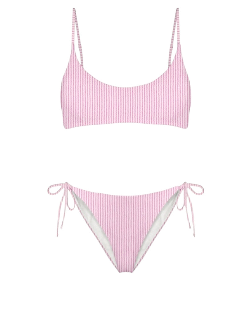 Bikini in tessuto elasticizzato in fantasia rigata, reggiseno modello bralette con bretelle sottili e regolabili, slip con laccetti laterali.