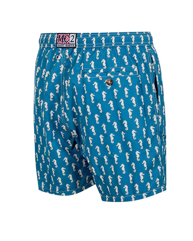 Costume MC2 Sainth Barth "Micro Seahorse" in nylon Blu petrolio, stampa su tutta la superficie, elastico in vita con coulisse., fodera interna in rete, tasche a filo, tasca sul retro con bottone.