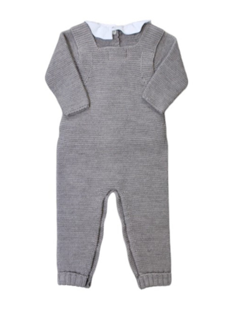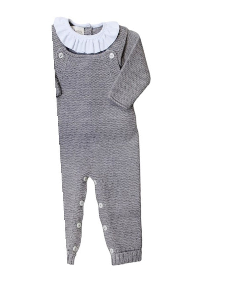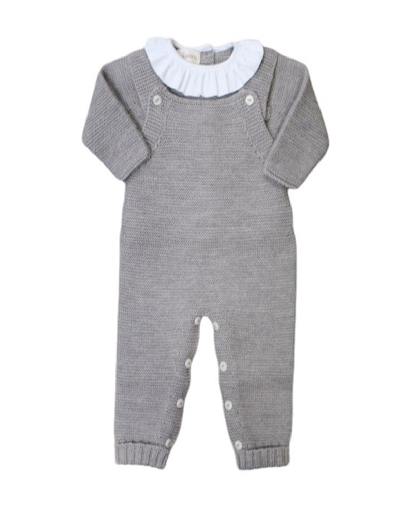 Salopette in lana a costa inglese con bottoncini in madreperla abbinata al maglioncino con collo tondo in piquet con rouches
