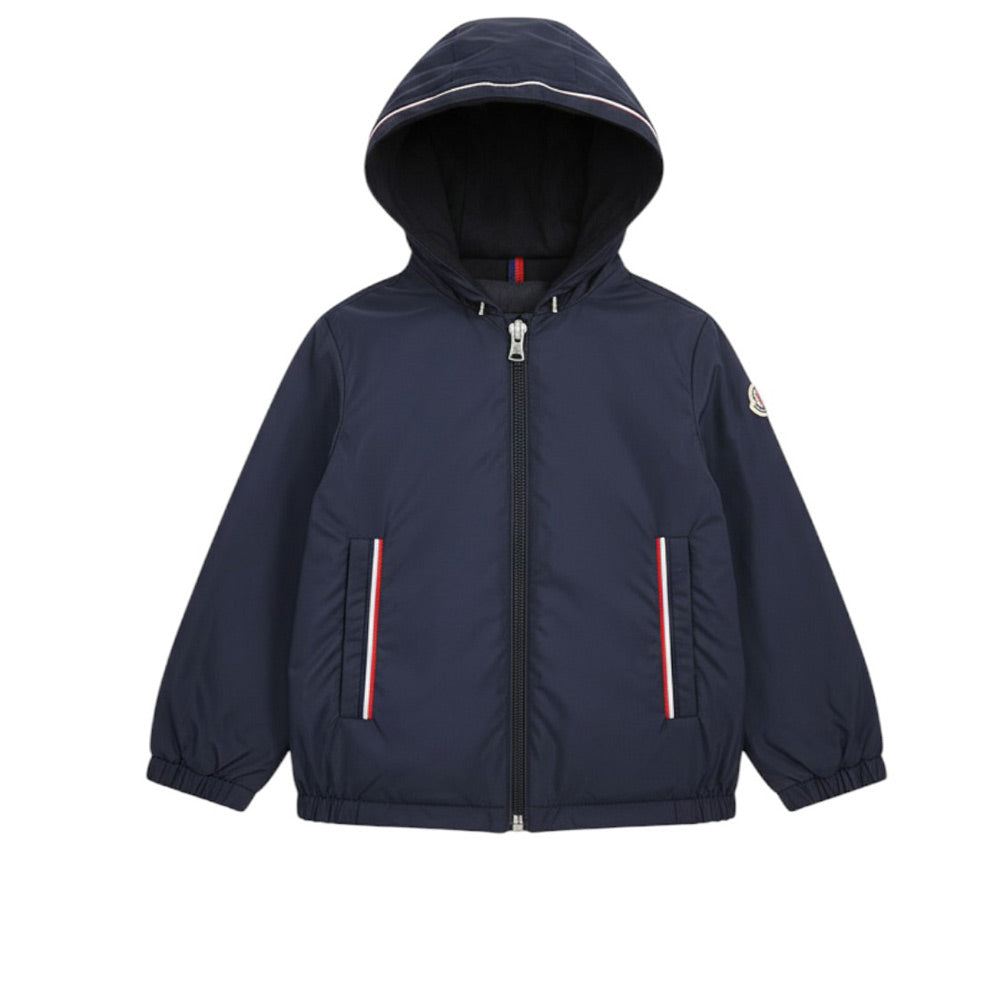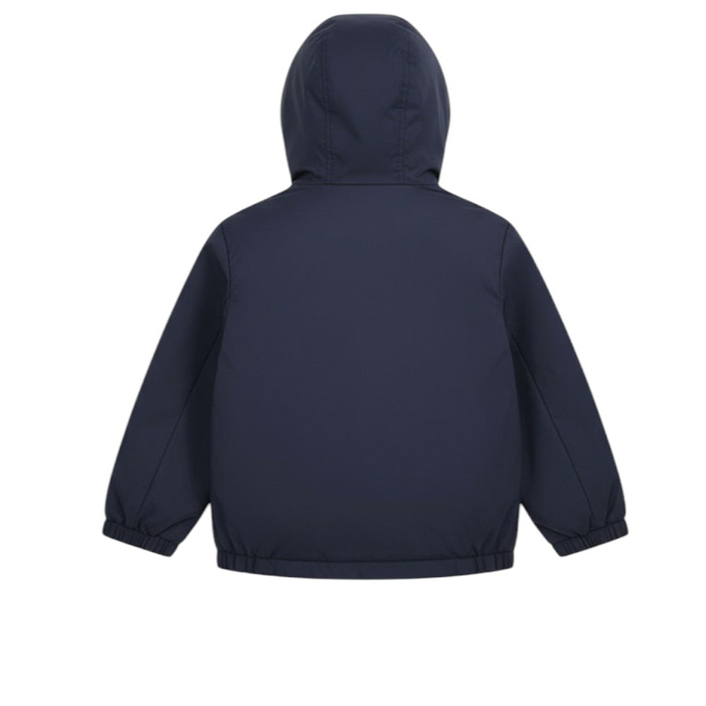 Giubbino antivento Granduc da neonato, realizzato in nylon. Presenta cappuccio fisso, fodera in jersey di cotone, chiusura frontale con zip, maniche lunghe, due tasche laterali a filetto con clips, polsi e orlo elasticizzati. È decorato con patch logo applicata sulla manica.