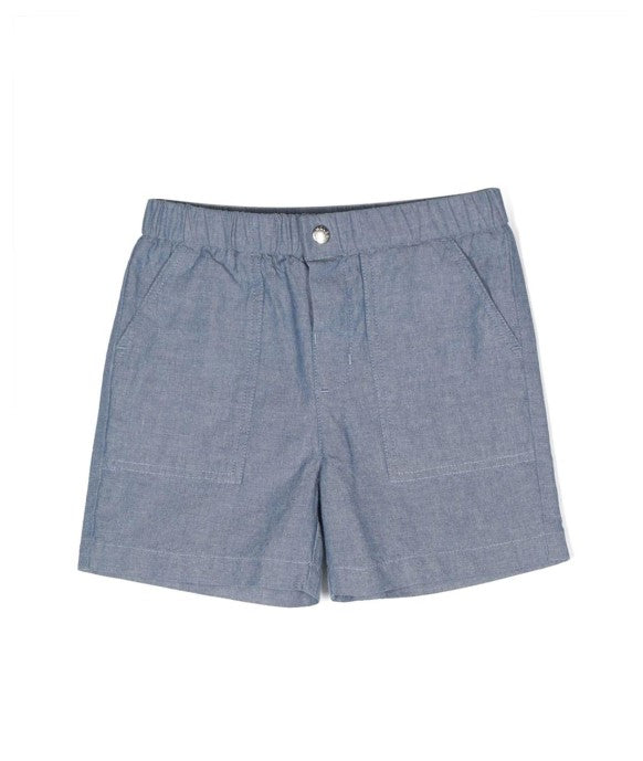 Shorts in denim di cotone, vita elasticcizata, tasche applicate sul davanti. Chiusura frontale con bottone a pressione e zip.