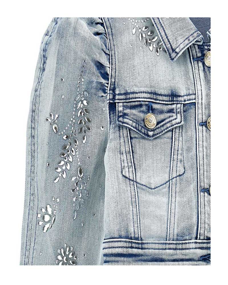 Giacca in denim crop, presenta le borchie di strass scintillanti e le maniche a sbuffo. Il colletto a punta, tasche con patella con chiusura di bottoni.