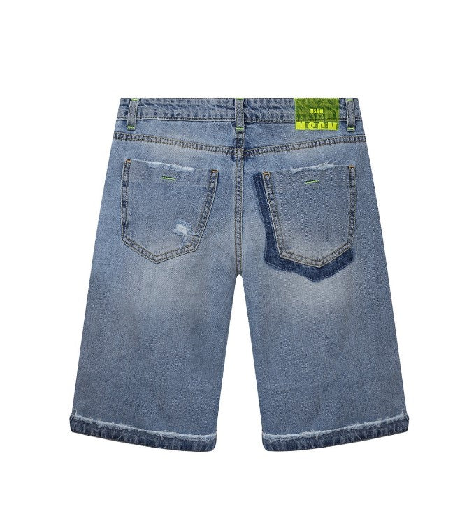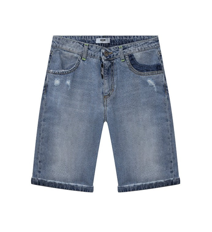 Bermuda in denim di cotone, modello cinque tasche. Label logata sulla patta frontale, chiusura anteriore con bottone e zip.