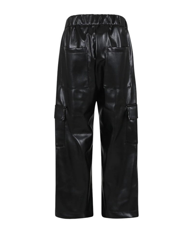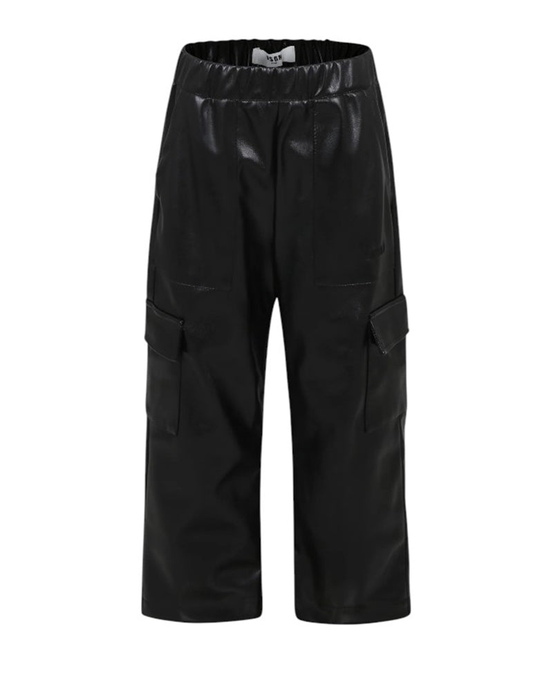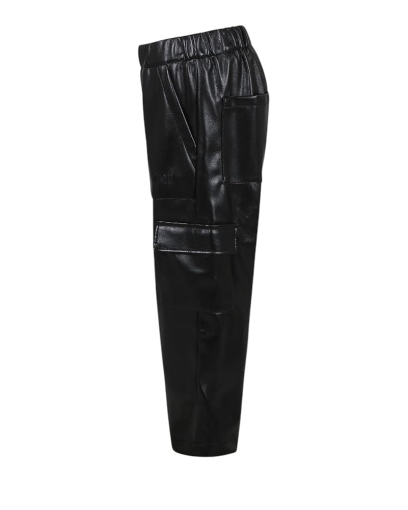 Pantaloni neri da bambina realizzati in similpelle, modello cargo. Presentano vita elasticizzata, due tasche laterali a filo, due tasche cargo ai lati e due tasche applicate sul retro. Sono decorati con logo ricamato sulla parte anteriore.