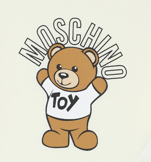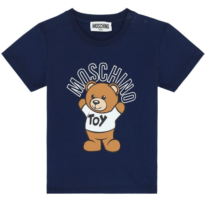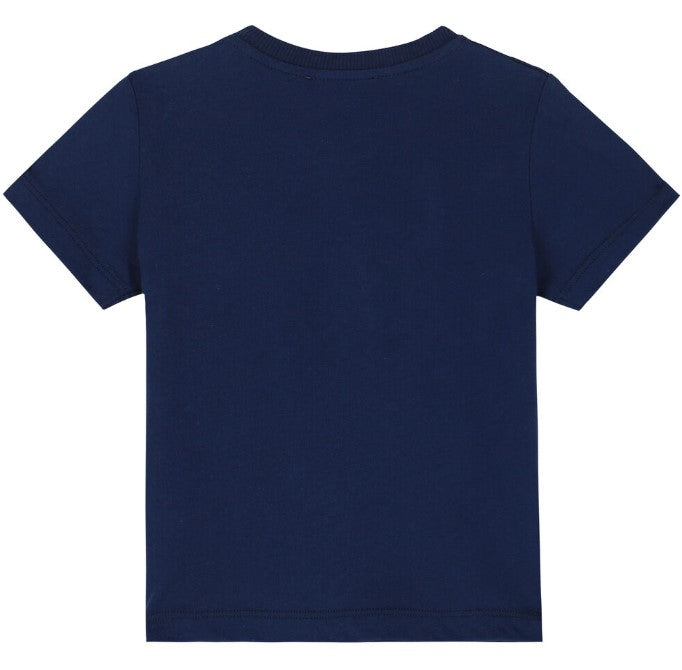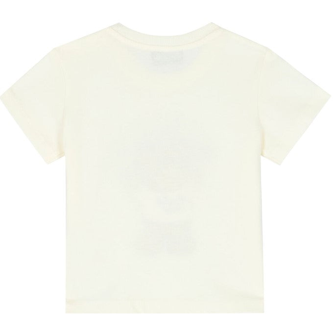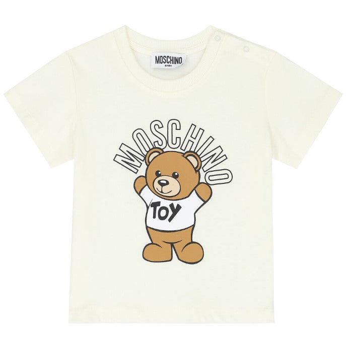 T-shirt girocollo manica corta con logo e simbolo stampato sul davanti. Clips di chiusura sulla spalla.