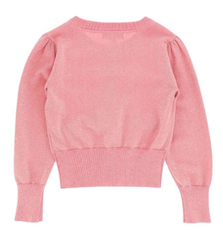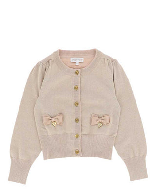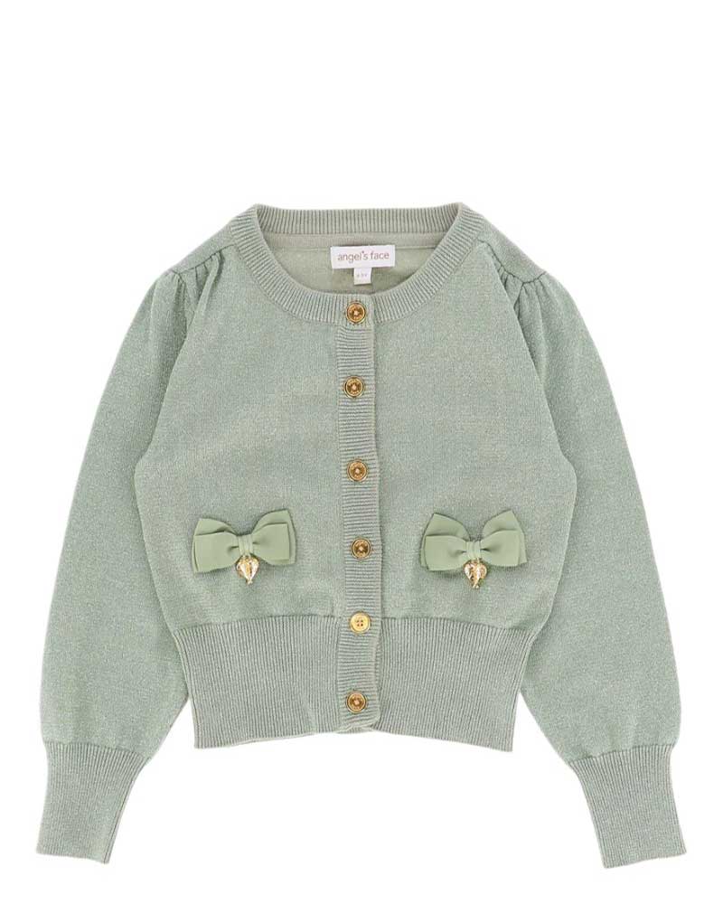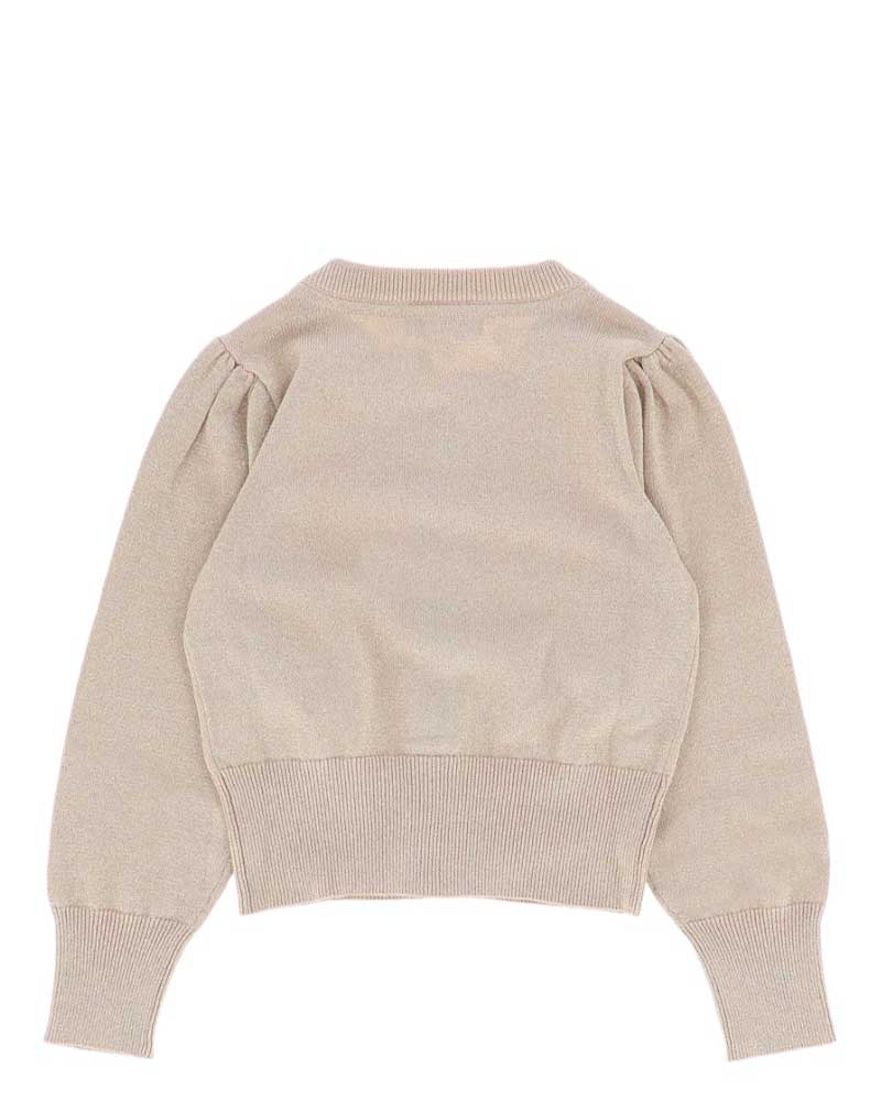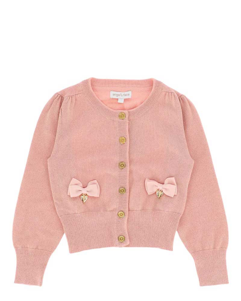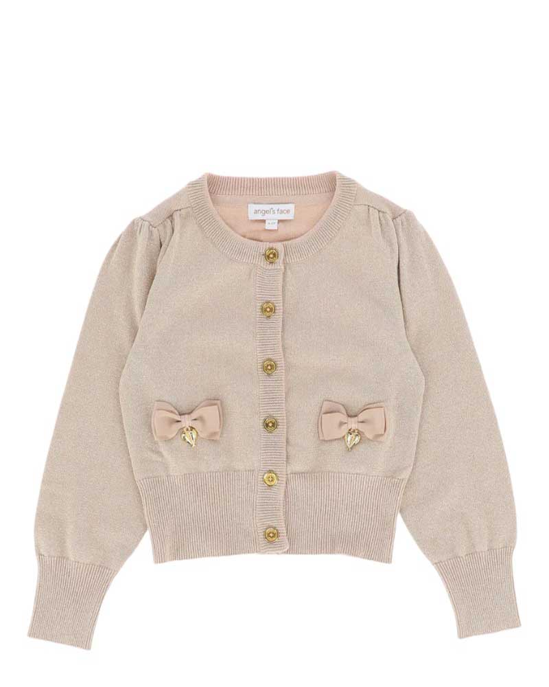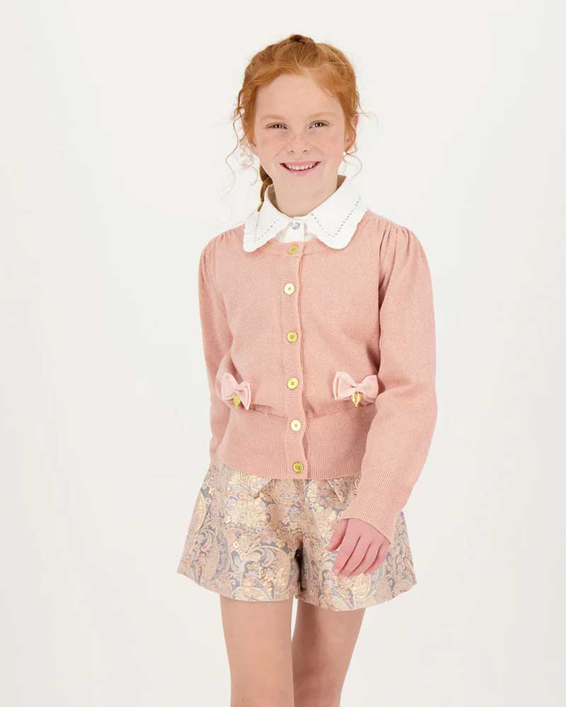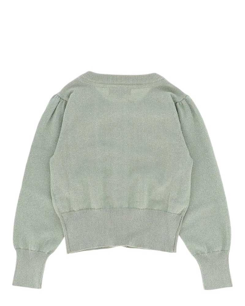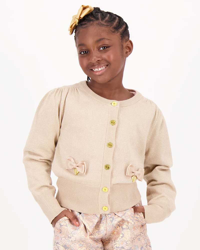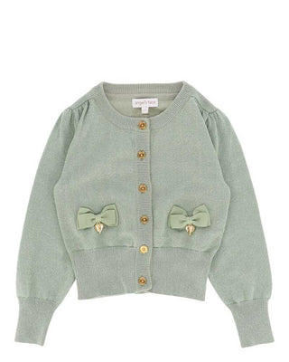 Maglia cardigan lavorato a maglia fine con effetto lurex, chiusura frontale con bottoni dorati, arricciature sulle maniche e sulle spalle, rifiniture a coste, applicazioni fiocchi e ciondoli a cuore.