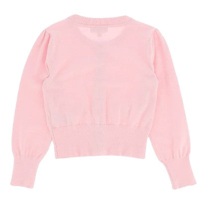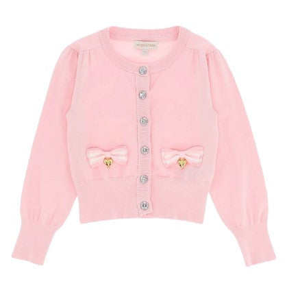 Maglia cardigan in filo di cotone, chiusura anteriore con bottoni gioiello, due fiocchi con ciondoli dorati a forma di cuore sopra la vita, arricciature sulle maniche e sulle spalle.