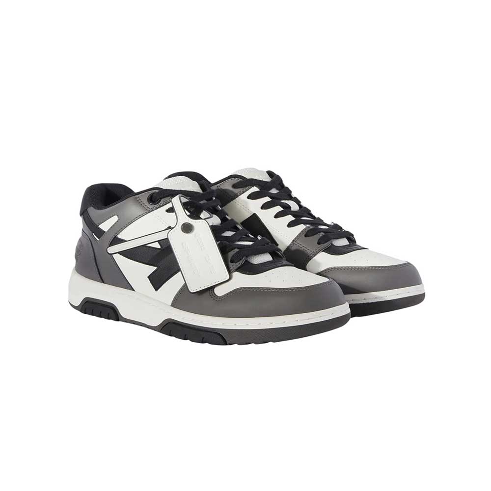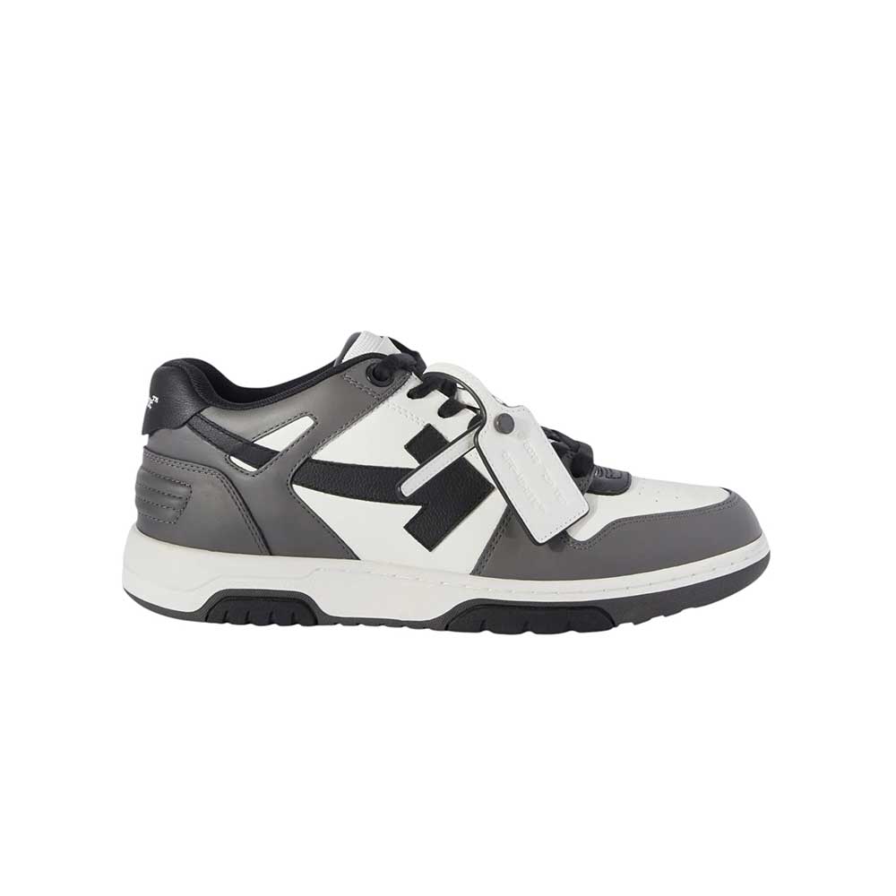 Raggiungi nuove vette con le Off-White Sneakers Out Of Office in pelle bianca, grigia e nera. La punta traforata e le freccie laterali ti portano lontano mentre il logo e la Zip-Tie danno un tocco ardito. Lascia il segno con la scarpa preferita dei sognatori!