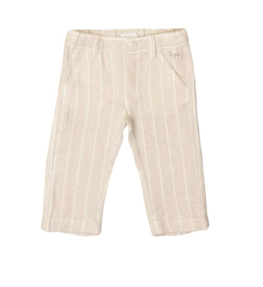 Pantalone neonato in lino, fantasia a righe, chiusura frontale con bottone, tasche laterali america, logo ricamato sul davanti.