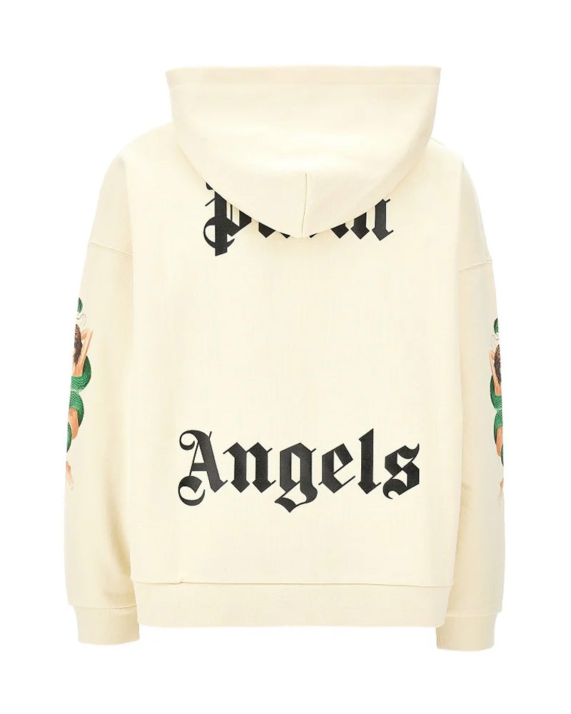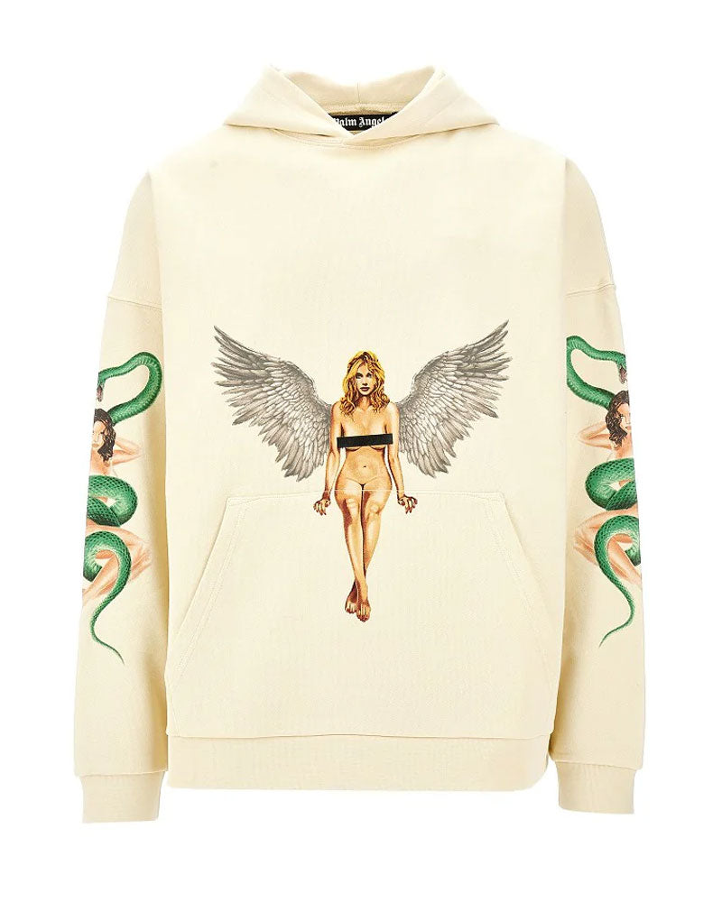 Felpa a maniche lunghe di Palm Angels con cappuccio e tasca frontale a marsupio. Presenta stampa immagine di Pin Up con ali d'angelo sul davanti, Pin Up con serpente stampata sulle maniche e logo Palm Angels stampato in nero lucido sul retro.