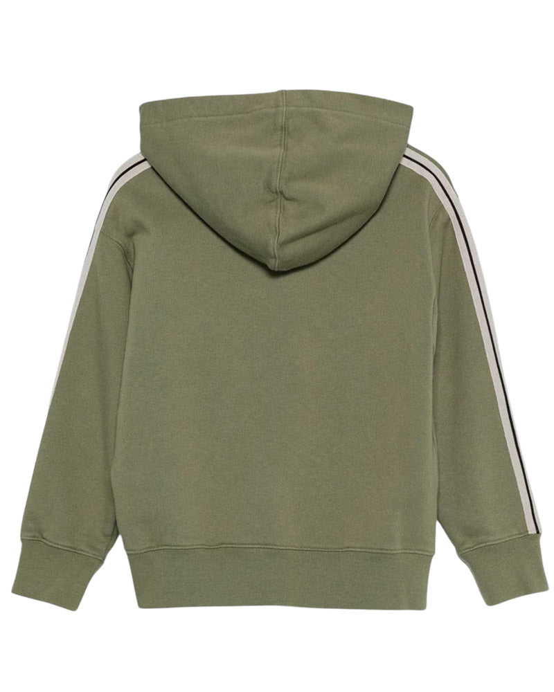 Felpa realizzata in cotone garzato, caratterizzata da cappuccio, maniche lunghe con bande in maglia ècru, polsi e orlo a coste. È decorata con stampa logo sul petto.