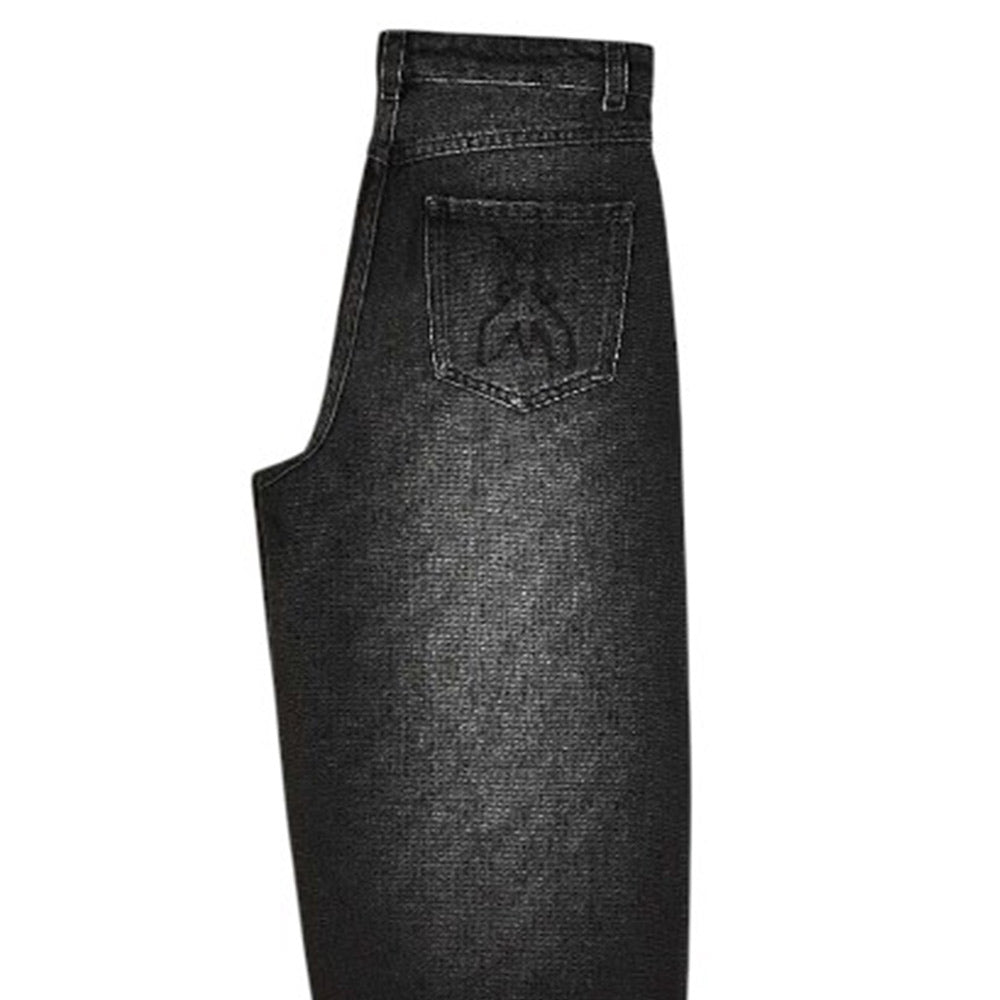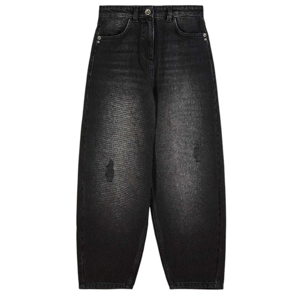 Jeans realizzati in denim nero con dettagli destroyed. Modello cinque tasche. Chiusura frontale con bottone e zip, vita regolabile grazie ad elastico interno con bottoni e logo ricamato sul retro.