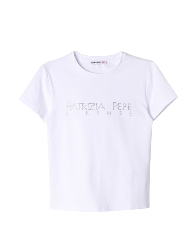 T-shirt girocollo a maniche corte in cotone da bambina con logo in rilievo e strass sul davanti.