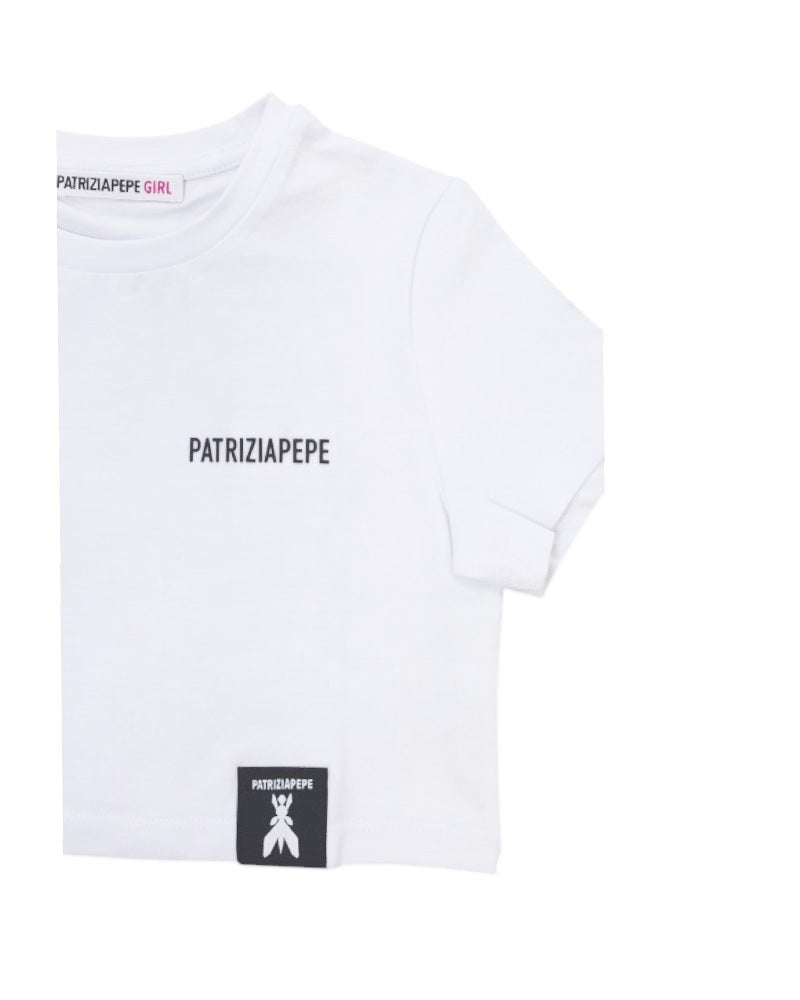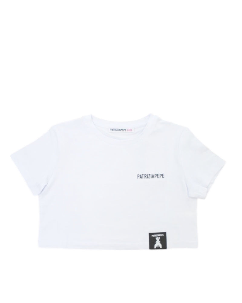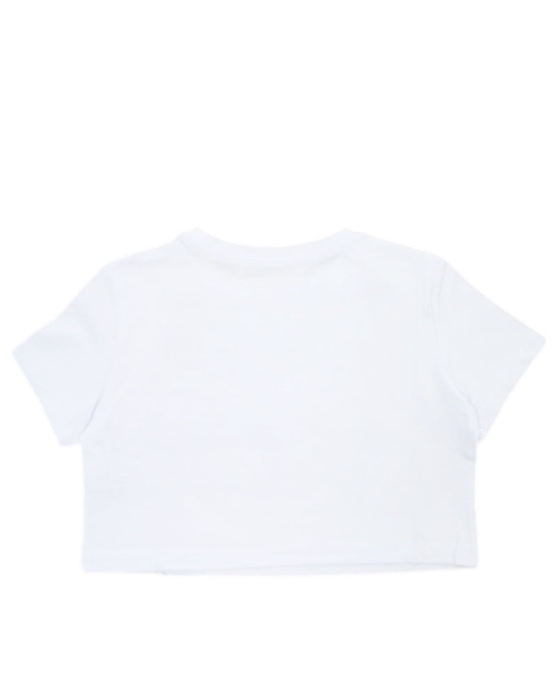 T-shirt girocollo a maniche corte in cotone da bambina, modello cropped, applicazione logo sul petto.