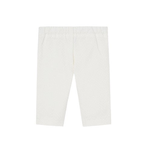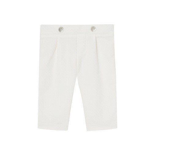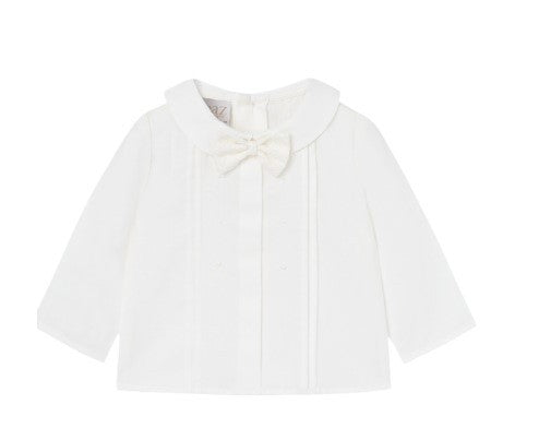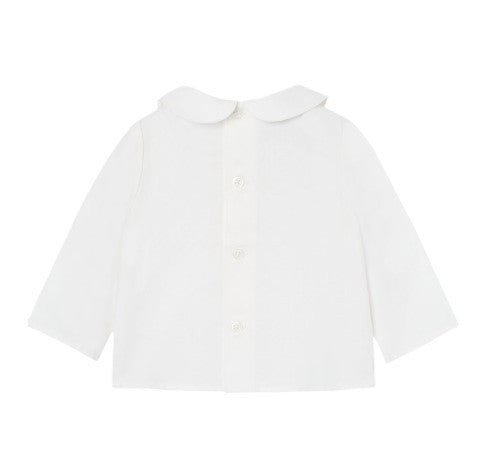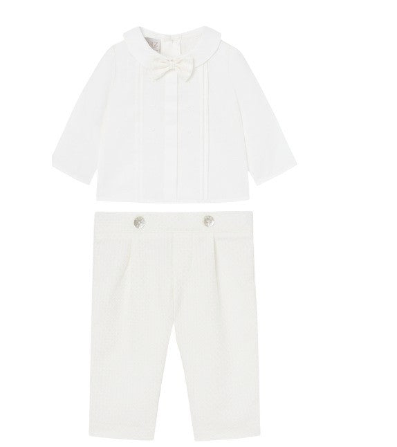 completo con Camicia a maniche lunghe per bimbo con pattina e dettaglio di punti ricamati. Include una cravatta decorativa e colletto a bavero. Chiusura posteriore con bottoni dello stesso colore. pantalone con bottoncini in madreperla