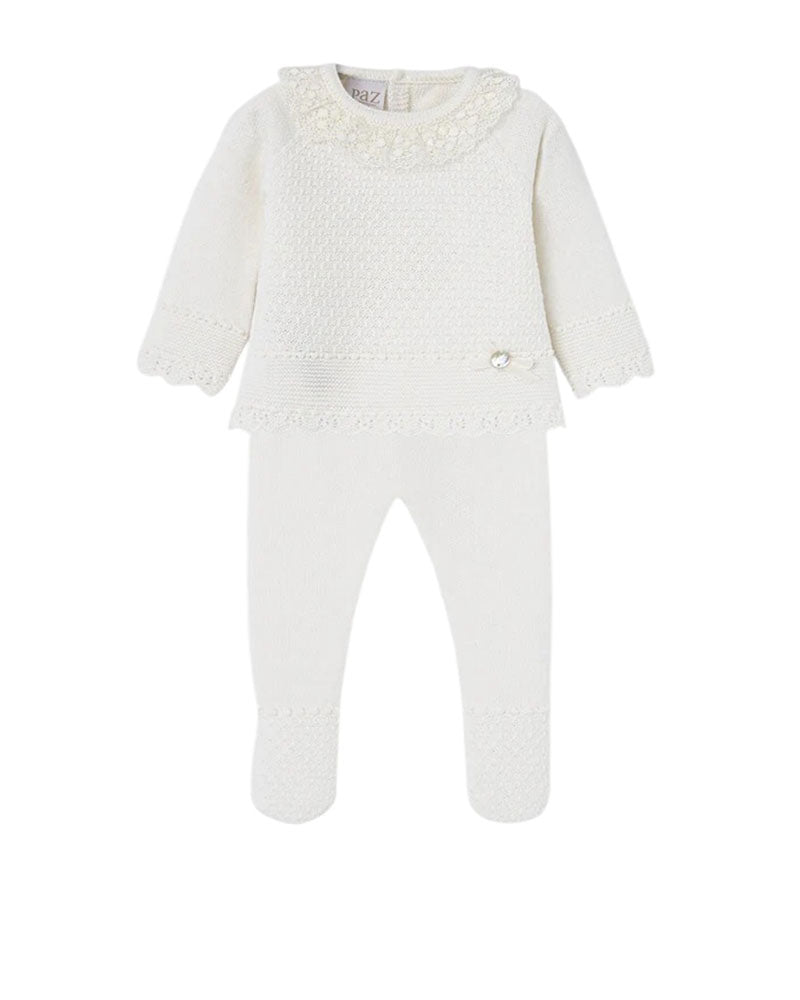 maglia color panna, composto da maglioncino a maniche lunghe con colletto in pizzo e dettagli traforati, e pantaloni coordinati. Sul bordo del maglioncino è applicato un fiocchetto con bottone decorativo. Elegante e delicato, perfetto per cerimonie o occasioni speciali.