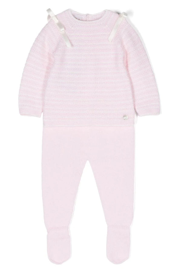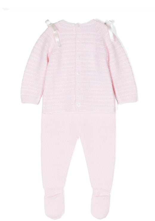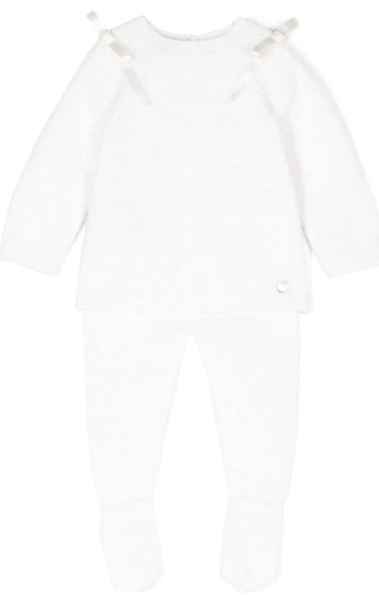 tutina 2 pezzi in pura lana motivo maglia traforata fiocchetti in raso sulle spalle. Chiusura posteriore con bottoni coordinati.