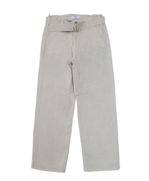 Pantalone con gamba dritta, chiusura frontale con bottoni e zip, tasca america, cintura applicata.