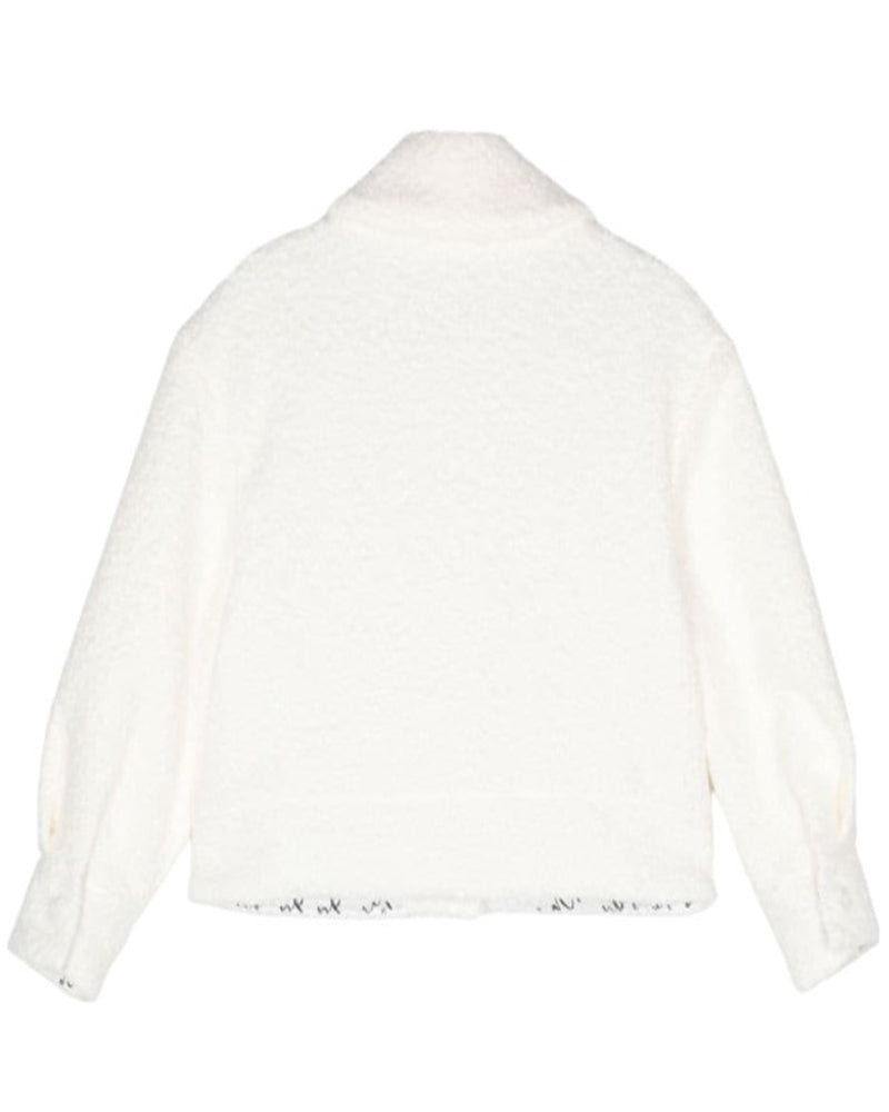 Ecopelliccia da bambina in shearling ecologico. Presenta coletto a punta, chiusura frontale con bottoni, maniche lunghe con bottoni ai polsi, tasche laterali. È decorata con placca logata applicata sul davanti.