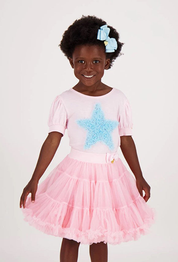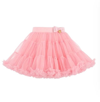 Gonna bambina a balze realizzata in tulle voluminoso. Elastico in vita con fiocco e ciondolo a forma di cuore.