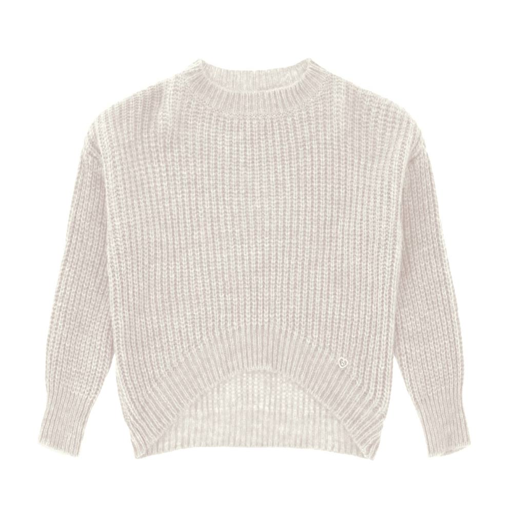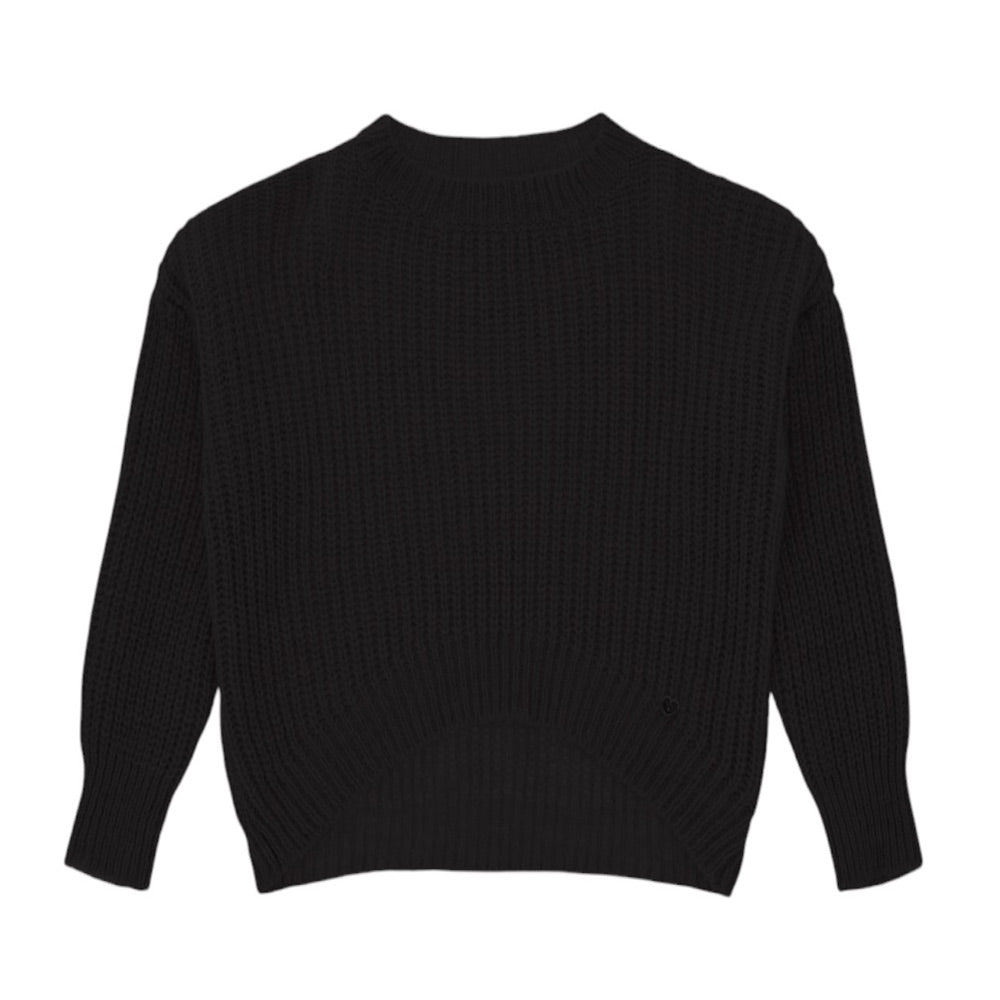 Maglia realizzata in misto lana, caratterizzata da collo tondo, maniche lunghe, orlo asimmetrico e finiture a coste. È decorata con placca logo in metallo applicata sul davanti.