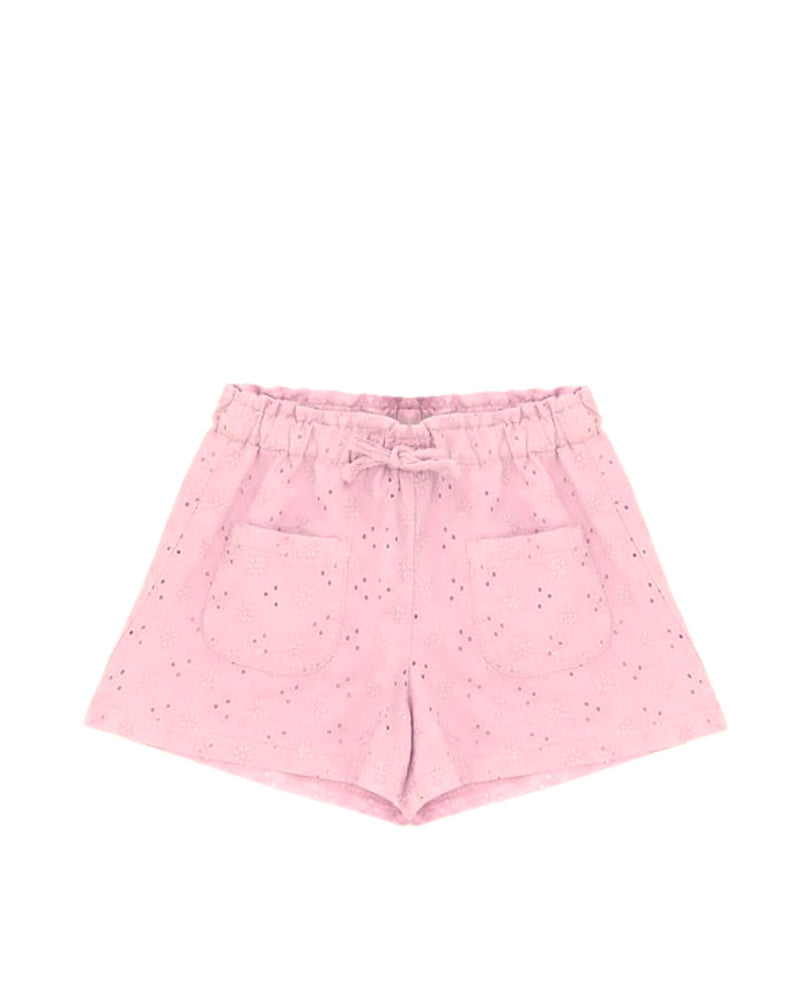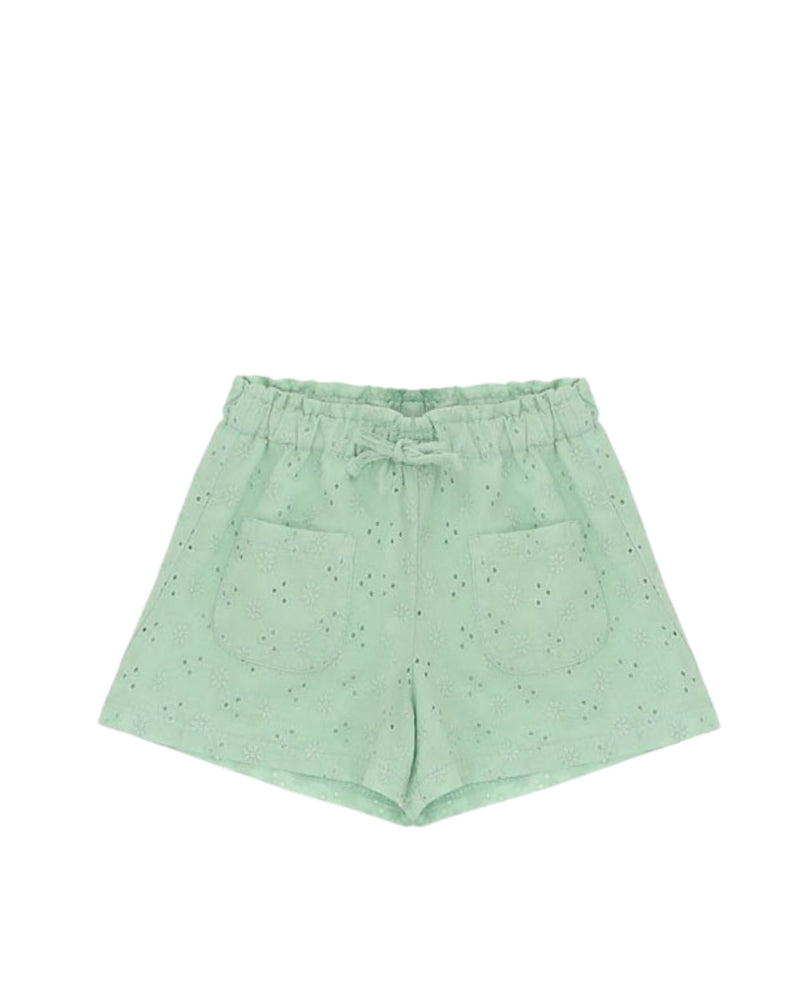 Shorts realizzato in pizzo Sangallo, vita elasticizzata con coulisse, taschine applicate.