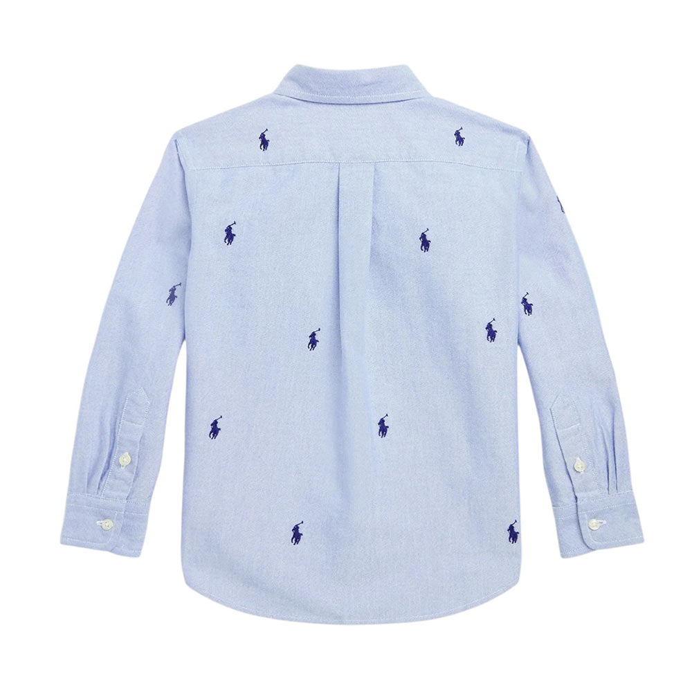 Camicia Oxford realizzata in cotone, caratterizzata da colletto button-down, chiusura frontale con bottoni, maniche lunghe con polsi abbottonati e orlo curvo. È decorata con ricamo Pony all-over.
