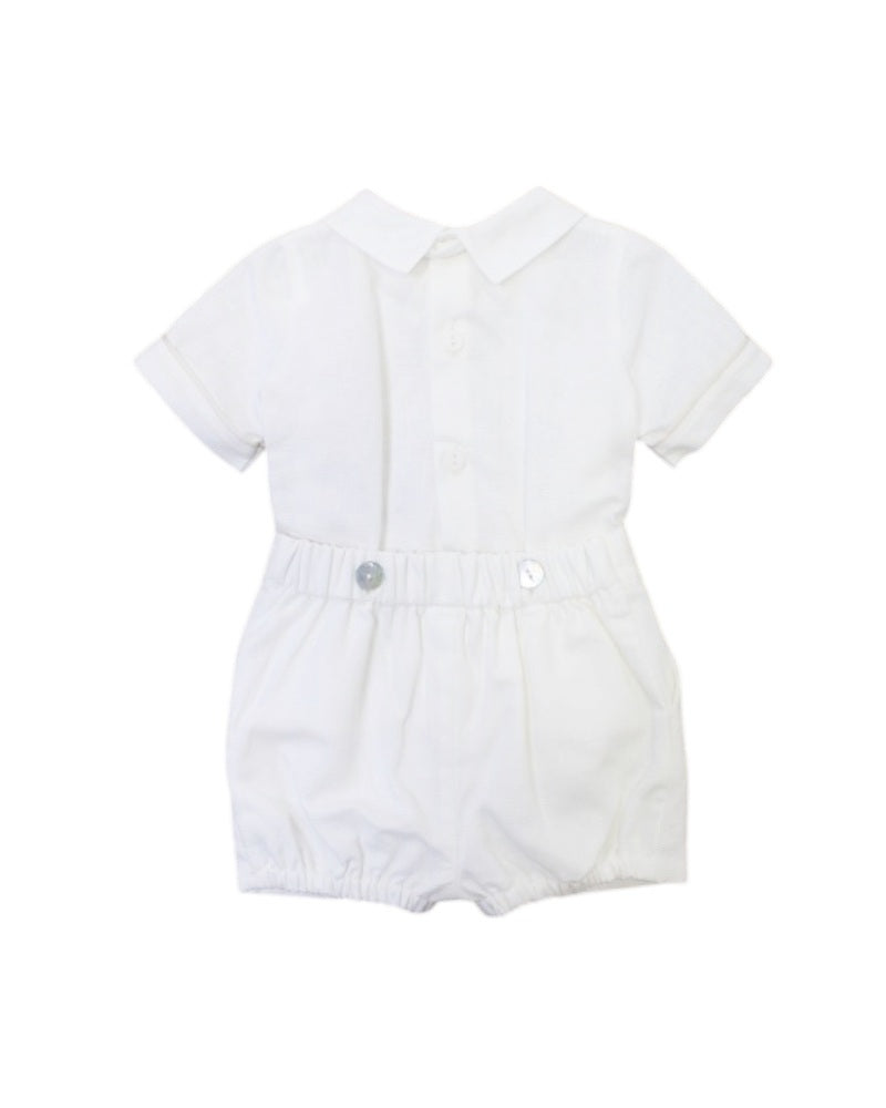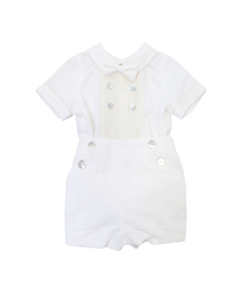 Competo Cerimonia maschietto in misto lino camicia collo alla francese e papillon fascia organza sul davanti e bottoncini in madreperla unito da bottoni interni al pantaloncino corto modello culotta