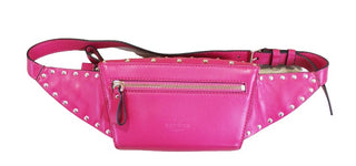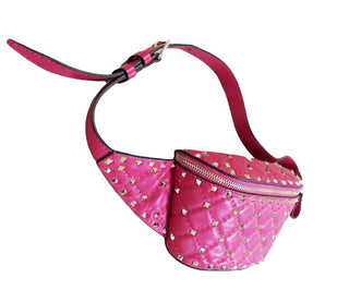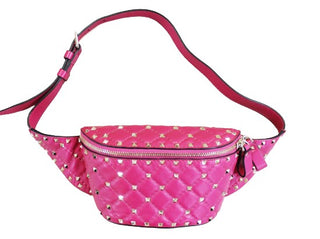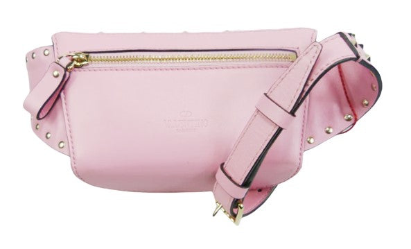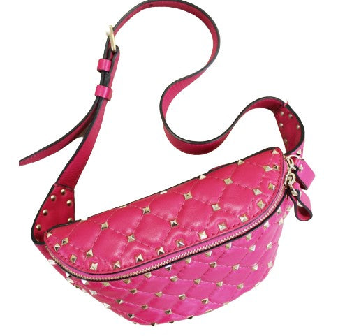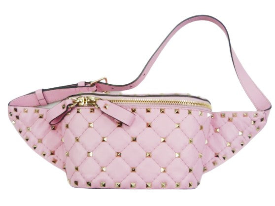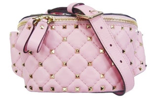 Marsupio Valentino Garavani in pelle di vitello rosa con borchie dorate applicate, effetto trapuntato a rombi, apertura con due zip e dettaglio in pelle, tasca interna e posteriore con zip, cinturino regolabile lunghezza 30 cm.