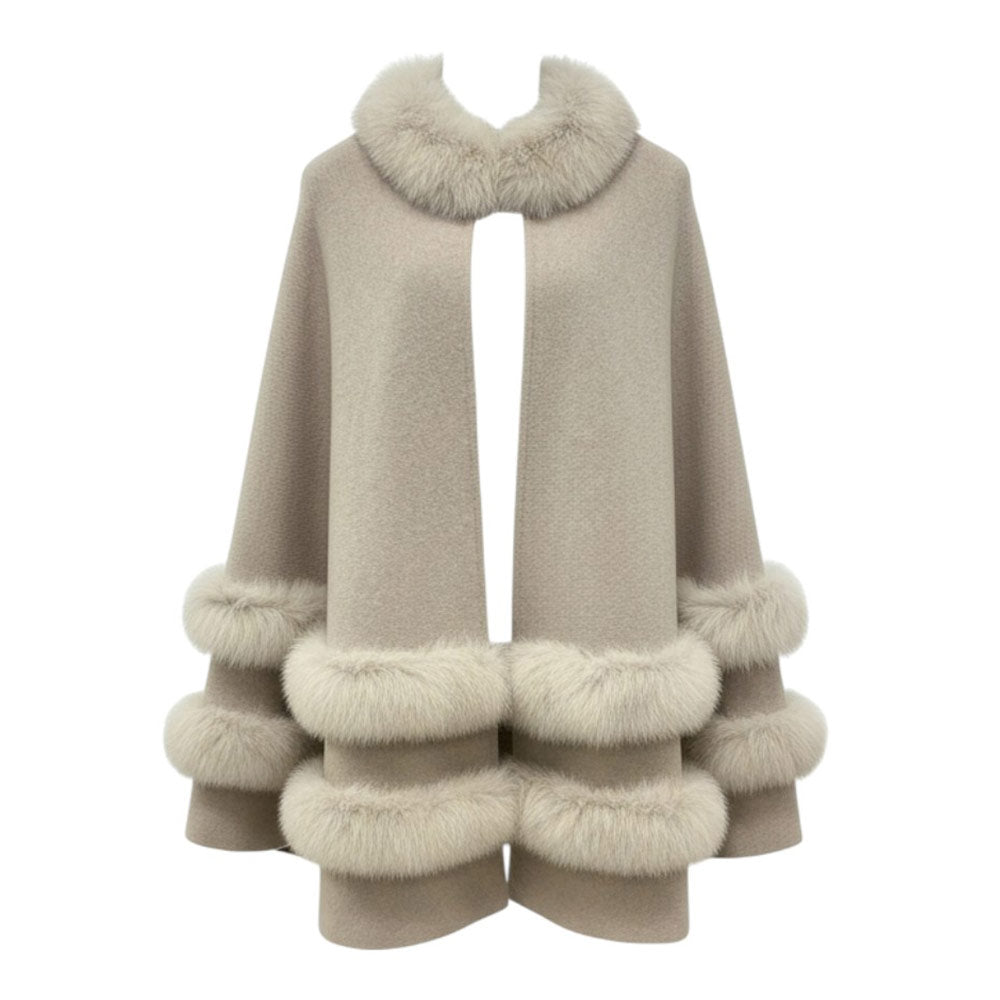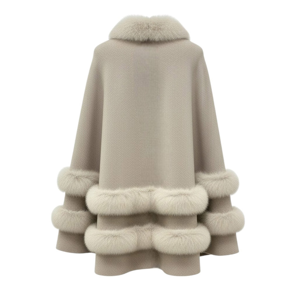 Mantella realizzata in misto lana e cashmere, con inserti in pelliccia di volpe e chiusura frontale nascosta con gancio.