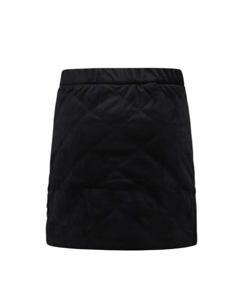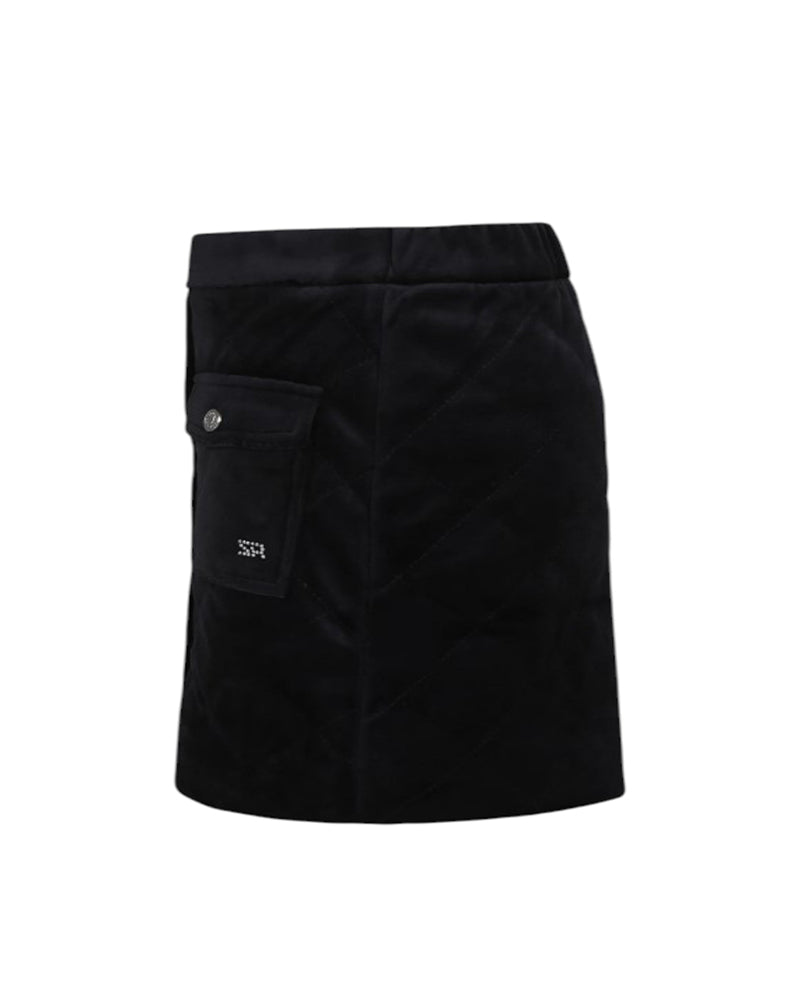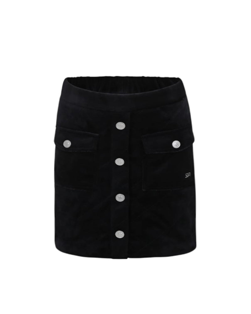 Gonna nera da bambina realizzata in ciniglia. Presenta design trapuntato, vita elasticizzata sul retro e orlo dritto. È arricchita da bottoni decorativi, due tasche applicate con patta e applicazione logo con strass sulla parte anteriore.