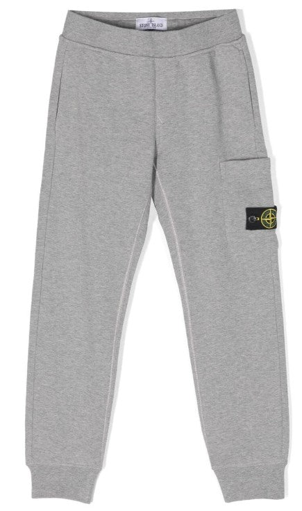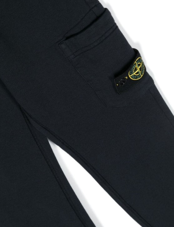 Pantalone bimbo jogger in felpa di cotone. Modello cargo con elastico in vita ed alla caviglia. Due tasche laterali a filetto, un tascone sulla gamba con patch logo rimovibile.