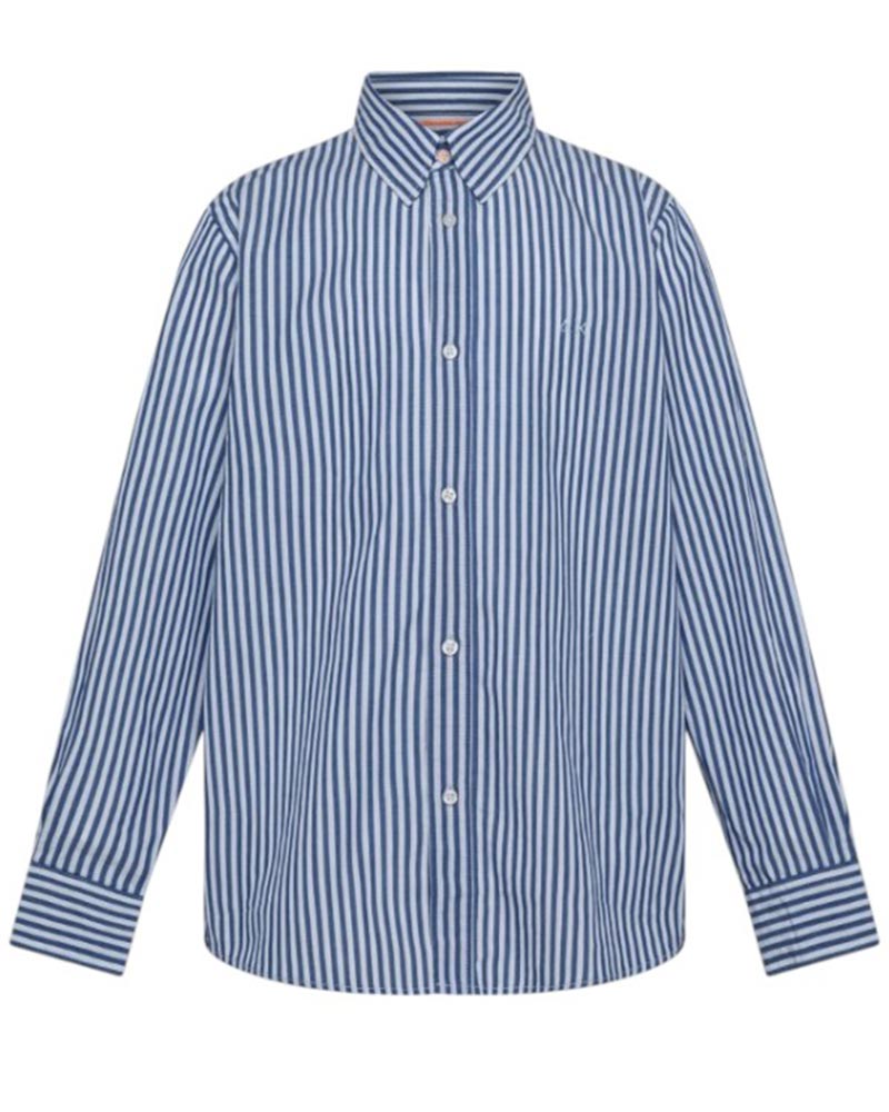 Camicia realizzata in popeline di cotone da bambino. Presenta fantasia a righe all-over, colletto a punta, chiusura frontale con bottoni, maniche lunghe con bottoni ai polsi. È decorata con logo ricamato sul petto.