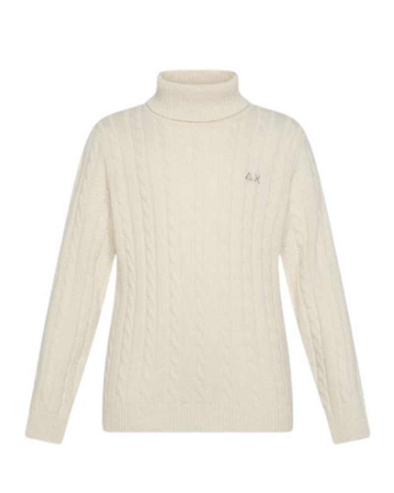 Maglia in misto lana e cashmere, lavorazione a trecce, collo dolcevita, maniche lunghe, bordi rifiniti a costine, logo SUN68 ricamato sul petto.