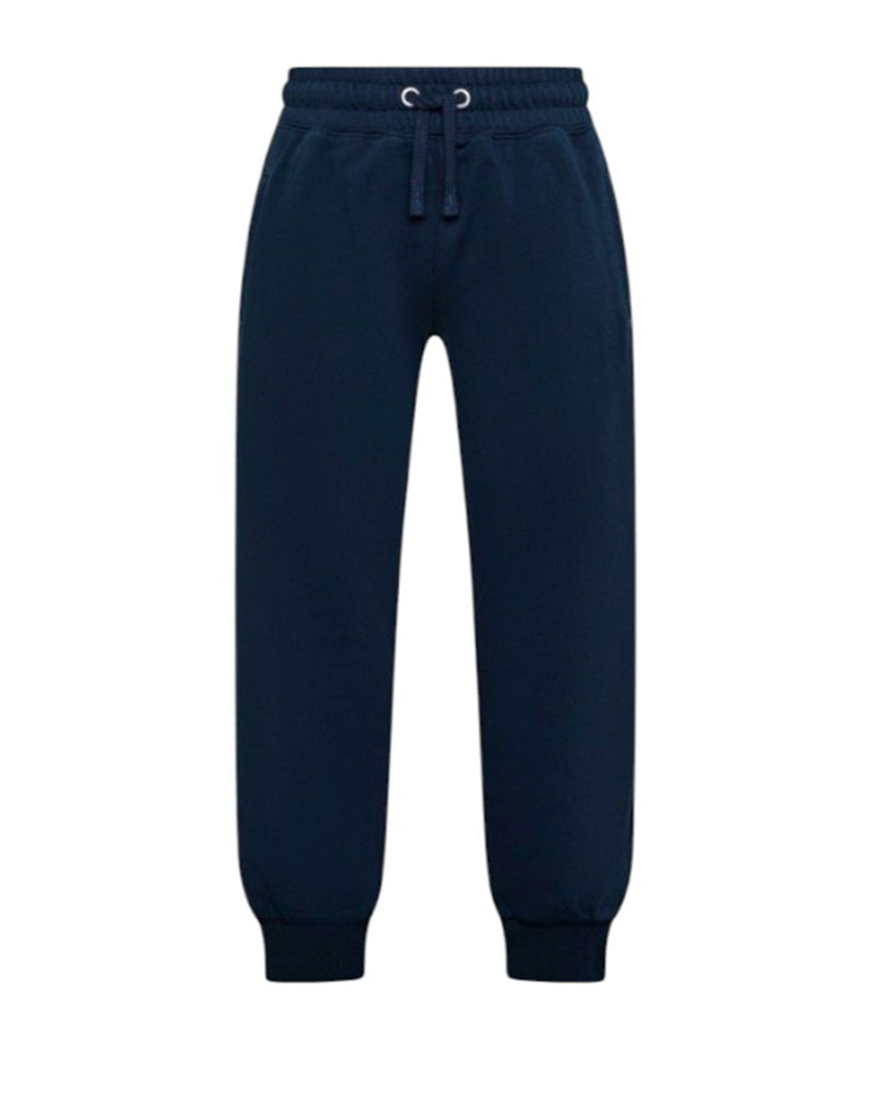 Pantaloni jogger realizzati in felpa di cotone sgarzato da bambino. Presentano vita elasticizzata con coulisse, tasche laterali a filo con zip, tasca sul retro e fondo con elastico alla caviglia. Sono decorati con logo ricamato sul retro.
