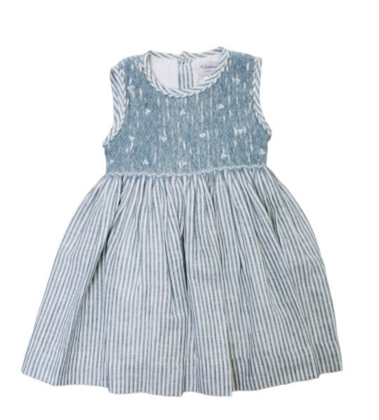 Abito girocollo giromanica, chiusura con bottoni sul retro, punto smock e ricamo a mano sul corpetto, cintura con fiocco sul retro.