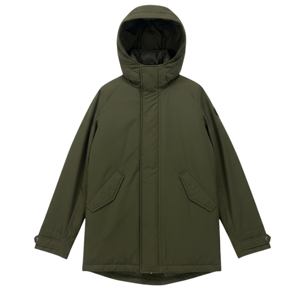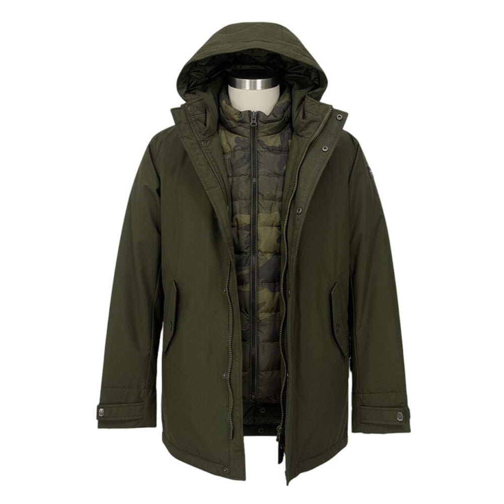Parka realizzato in tessuto Urban Touch idrorepellente e resistente al vento. Presenta ampio cappuccio fisso, chiusura frontale con zip e bottoni a pressione, maniche lunghe con patch logo, due tasche laterali all'americana con patta e orlo asimmetrico. È dotato di gilet estraibile in nylon trapuntato, con fantasia mimetica.